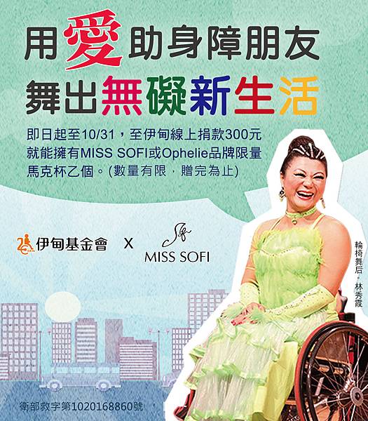 在台灣,身心障礙者已超過110萬人。對許多身心障礙朋友而言,因為身體上的限制,除了要面臨生活與心理上的挫折,更經常需要面對自我認同問題及他人的異樣眼光,面對未來更是挑戰重重。即日起至10月31日,伊甸與MISS SOFI邀您至伊甸官網線上捐款響應『用愛助身障朋友,舞出無礙新生活』專案,一起支持「無障礙生活計畫」,幫助身障朋友建立全方位的支持網路,擁有專業技能訓練,再次擁抱生命!